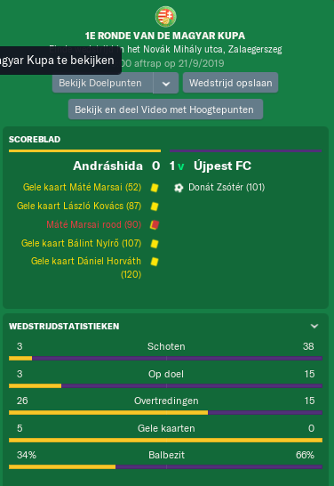 Zoals eerder gezegd mochten we voor de beker aantreden tegen derdeklasser Andráshida. Er zijn weleens van die wedstrijden waar de bal er gewoon niet in wil of de eindpass steeds niet goed is. Dit was er zo een... In de reguliere tijd konden we het net gewoonweg niet vinden. In de verlenging en tegen tien man gelukkig wel. Hierdoor zijn we nog steeds in de race om de beker te prolongeren.